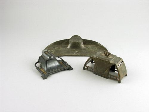 A WMF inkwell, with hinged cover, 5in (12.6cm) w, a Liberty pewter inkstand, 9in (23cm) w, and another, unmarked. (3)