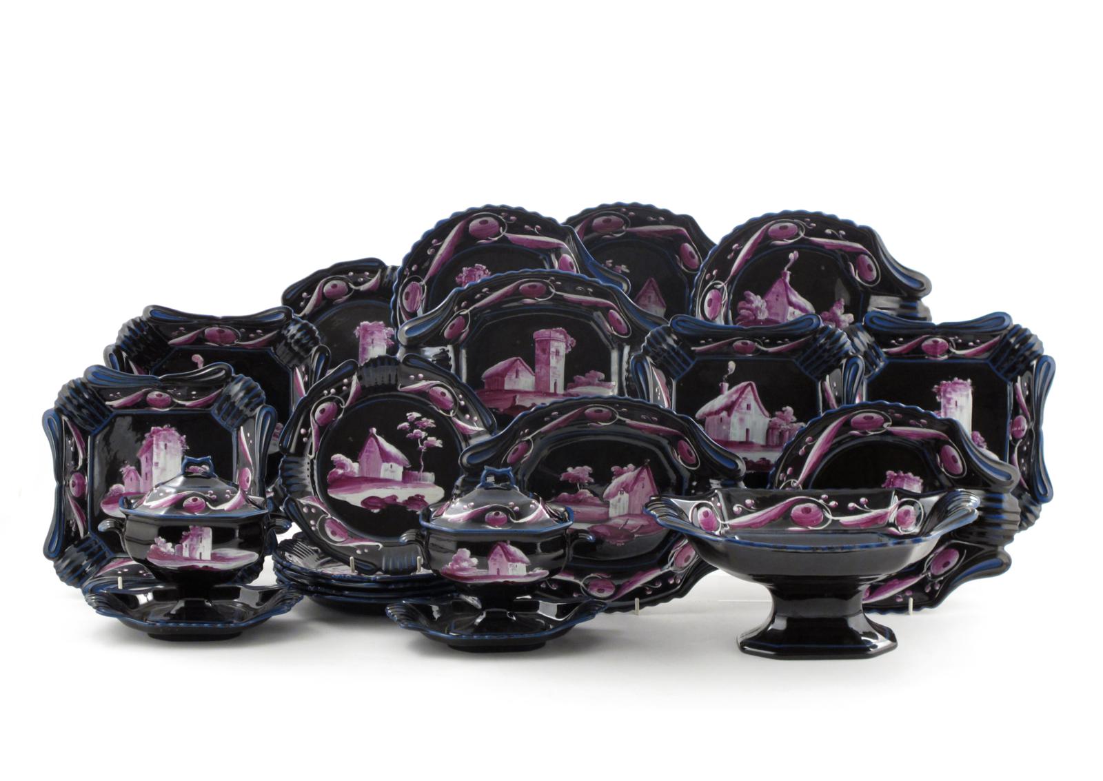 A good Thomas Lakin & Co pearlware dessert service c.1820, the dark surfaces enamelled in white and purple with rococo buildings in rural landscapes, the rims with a stylized fruit border. Comprising: an oval comport, two sauce tureens and covers, two oval dishes, four square dishes, four shell-shaped dishes and six plates. (21)