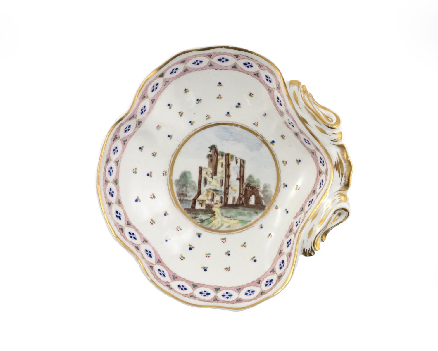 An extremely rare Caughley shell-shaped dish c.1790-93, painted with a panel containing a tall ruined building overgrown with greenery, reserved on a ground of tiny stylized flower sprigs within a pink band border with a continuous oval design, a little wear and some chipping to the rim, 20cm.