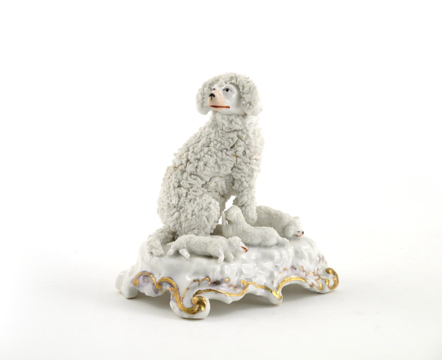A Staffordshire porcelain model of a poodle and puppies c.1820-30, the mother seated on her haunches with head turned, her three puppies playing or sleeping by her feet, raised on a scrolling base highlighted with gilding, 12.5cm high.
