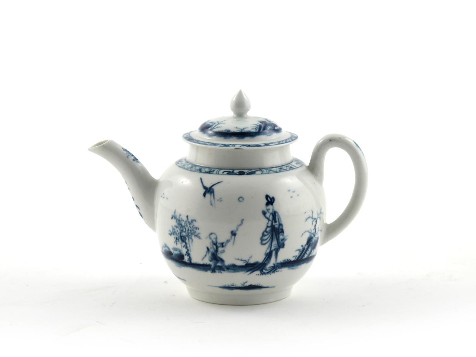 A Worcester blue and white teapot and cover c.1760, painted with the Walk in the Garden pattern, each side with a young Chinese boy accompanied by his mother with a bird in flight above, open crescent mark, a chip to the underside of the cover, 18.8cm across. (2)