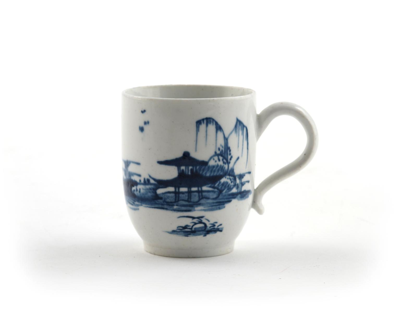 A Longton Hall blue and white coffee cup c.1758, painted with a Chinese pagoda beneath weeping willow, workman's numerals to the base, 6.2cm high.