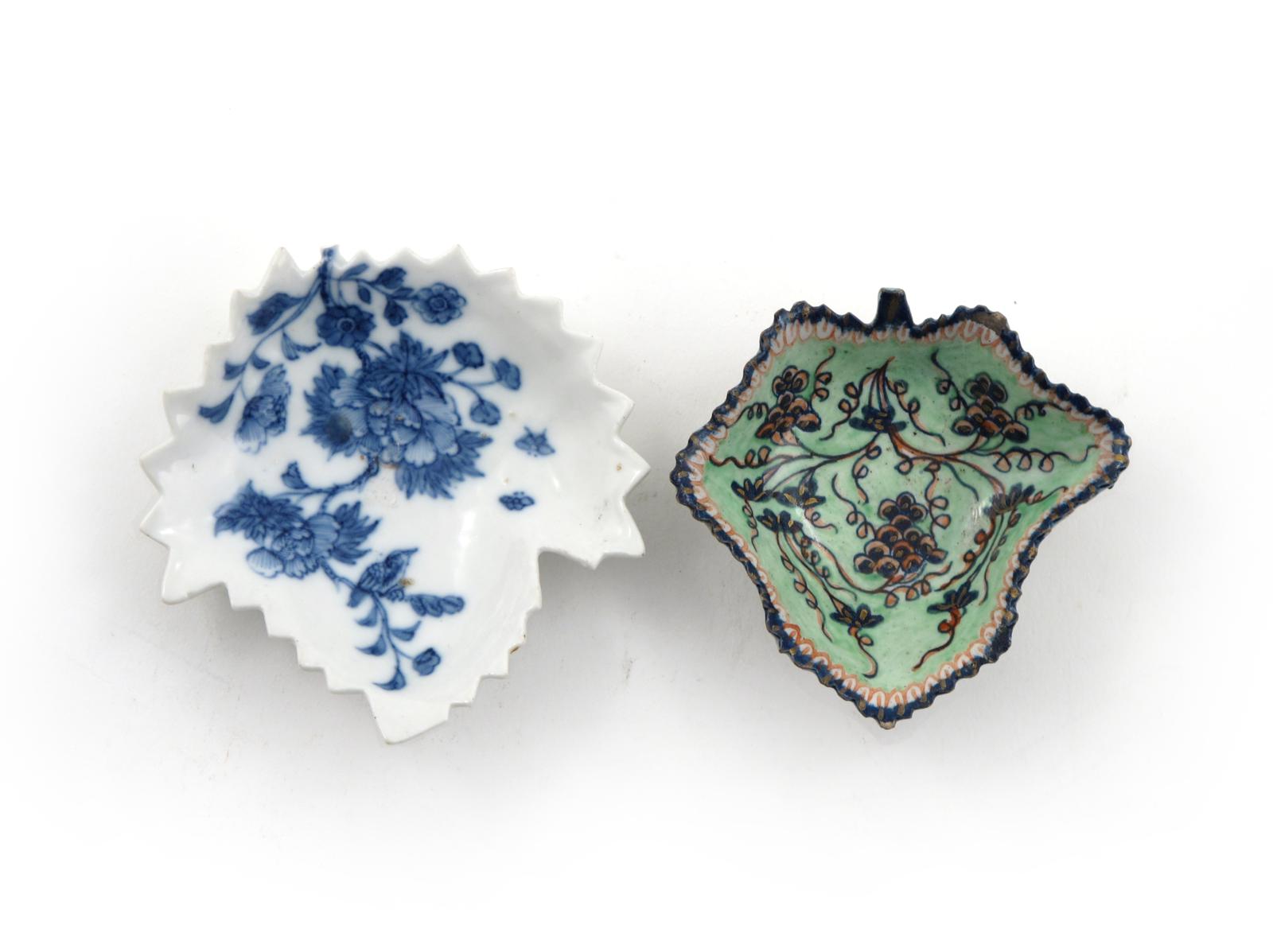 A Chinese soft-paste porcelain pickle dish 18th century, formed as a leaf and painted in blue with flying insects and a small bird on flowering branches, and an English porcelain pickle dish originally decorated with blue grapevine and later enamelled with green and red, tiny rim chips, 9.2cm max. (2)
