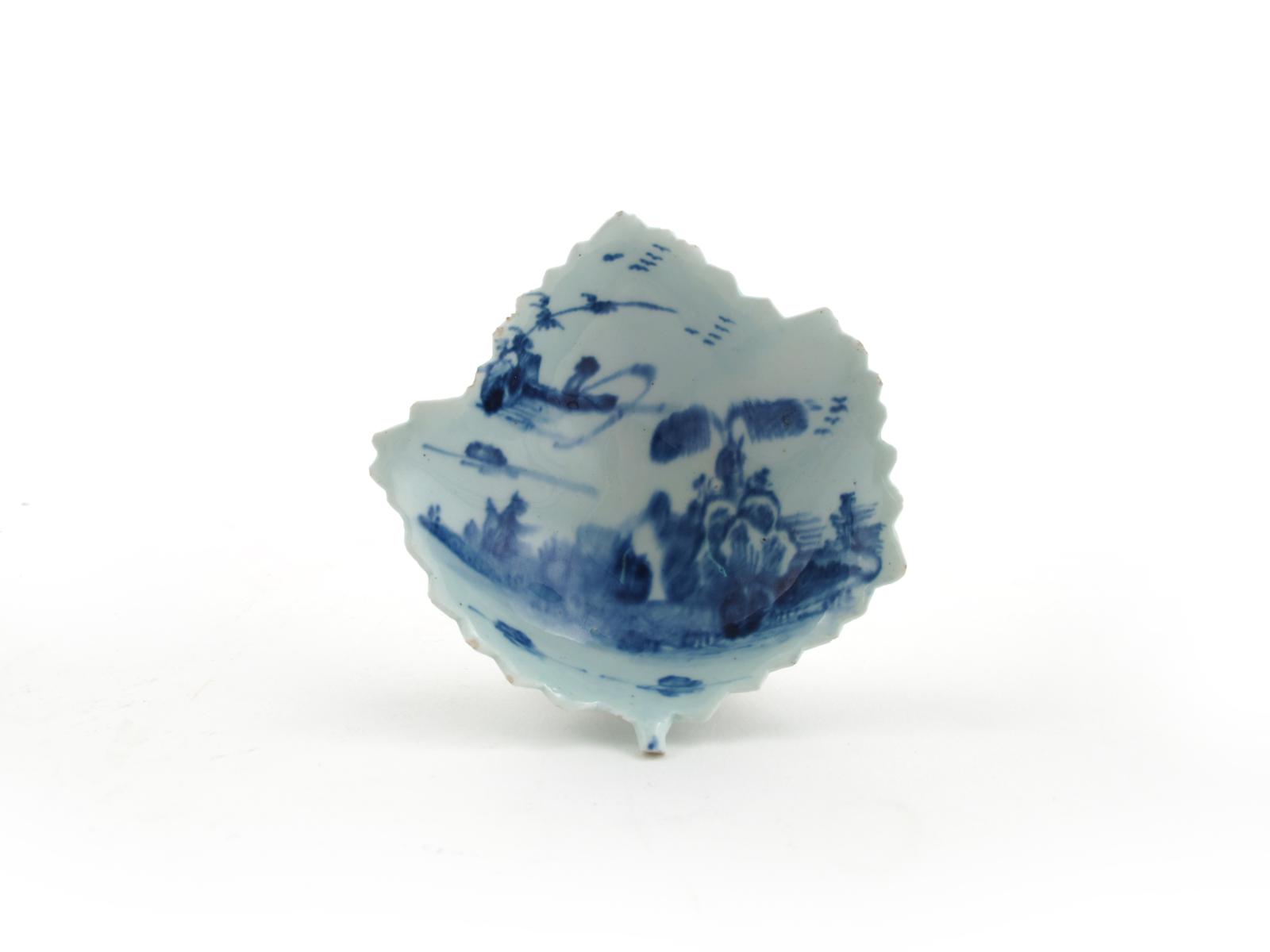 A rare Vauxhall blue and white leaf pickle dish c.1758, painted with a fisherman in an Oriental lakeside scene, a tiny chip to the stalk, 7.5cm.