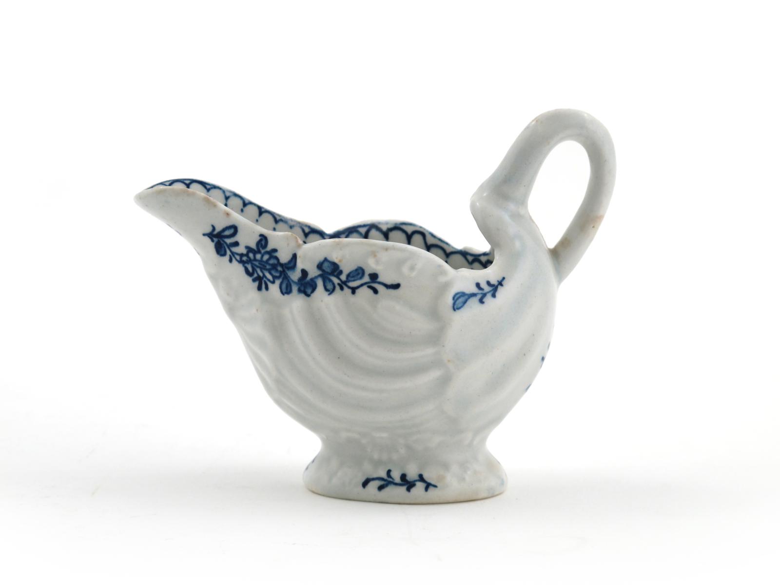 A Lowestoft blue and white creamer c.1770, of dolphin shape, the shell-moulded exterior painted with blue floral sprays, the interior rim with a jagged border, 9.5cm.
