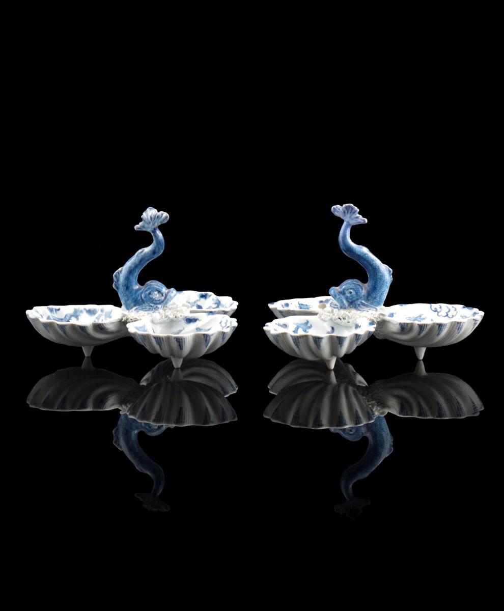 A rare pair of Bow blue and white triple salts c.1760, the interiors of the shells painted with the Dragon pattern and surrounding a dolphin with upturned tail, the bases encrusted with further small shells and raised on three triangular feet, 20.5cm across. (2)