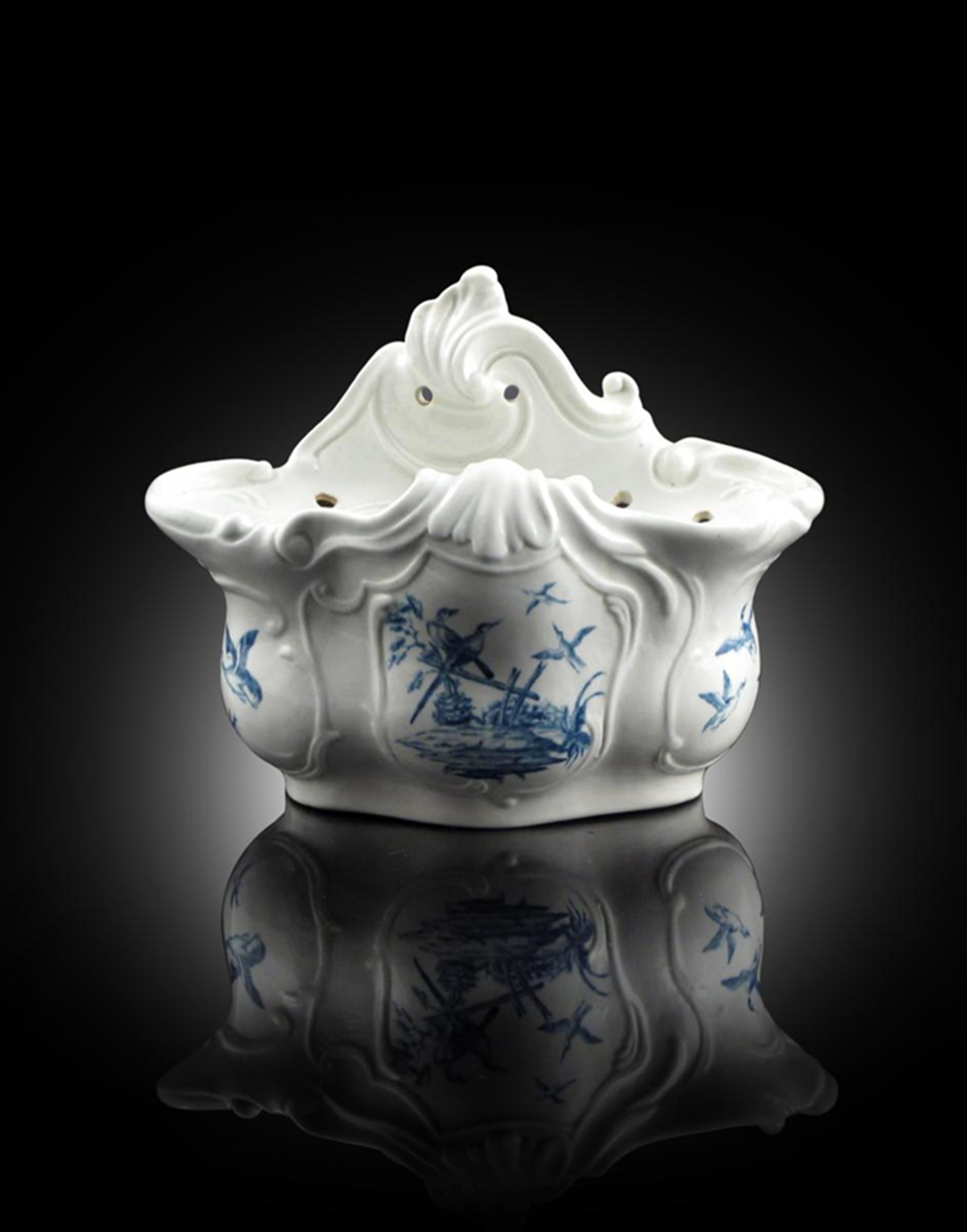 An extremely rare Worcester blue and white bough pot c.1757-58, painted perhaps by James Rogers with birds in flight and perched on a tumbledown fence, within rococo moulded panels, the back and rim elaborately scrolled, the top pierced with an arrangement of small holes around a larger opening, 21.5cm across.