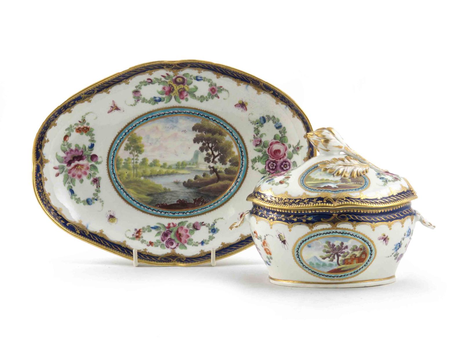 A Worcester sauce tureen with cover and stand c.1780-85, painted in the Dalhousie manner with oval panels of river scenes, lakeside views and ruins in landscapes, within floral garland arrangements and with scattered moths and other insects, the rims with blue and gilt borders, open crescent marks, 24cm. (3)