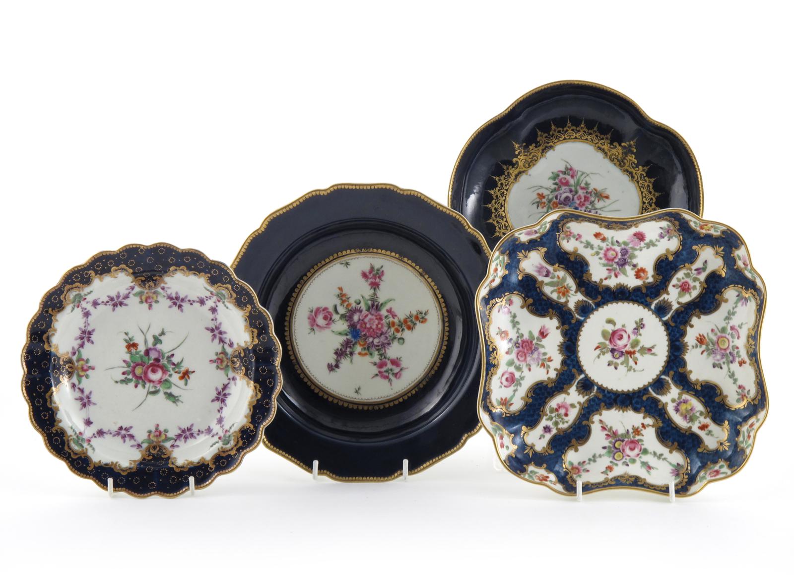 Four Worcester dishes c.1765-75, all painted with various polychrome flower sprays within gilt cartouches on blue and blue scale grounds, open crescent and square seal marks, 24.5cm max. (4)