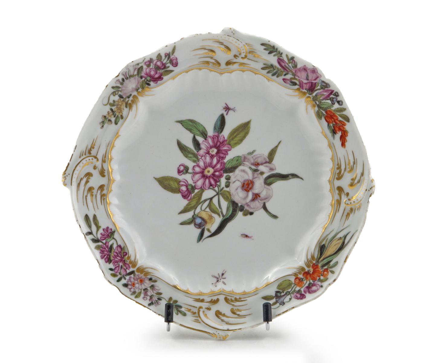 A good Chelsea plate c.1758, the well finely painted with flowers and small scattered flying insects, the rim moulded and painted with four further flower sprays issuing from moulded gilt scrolls, 21.7cm.