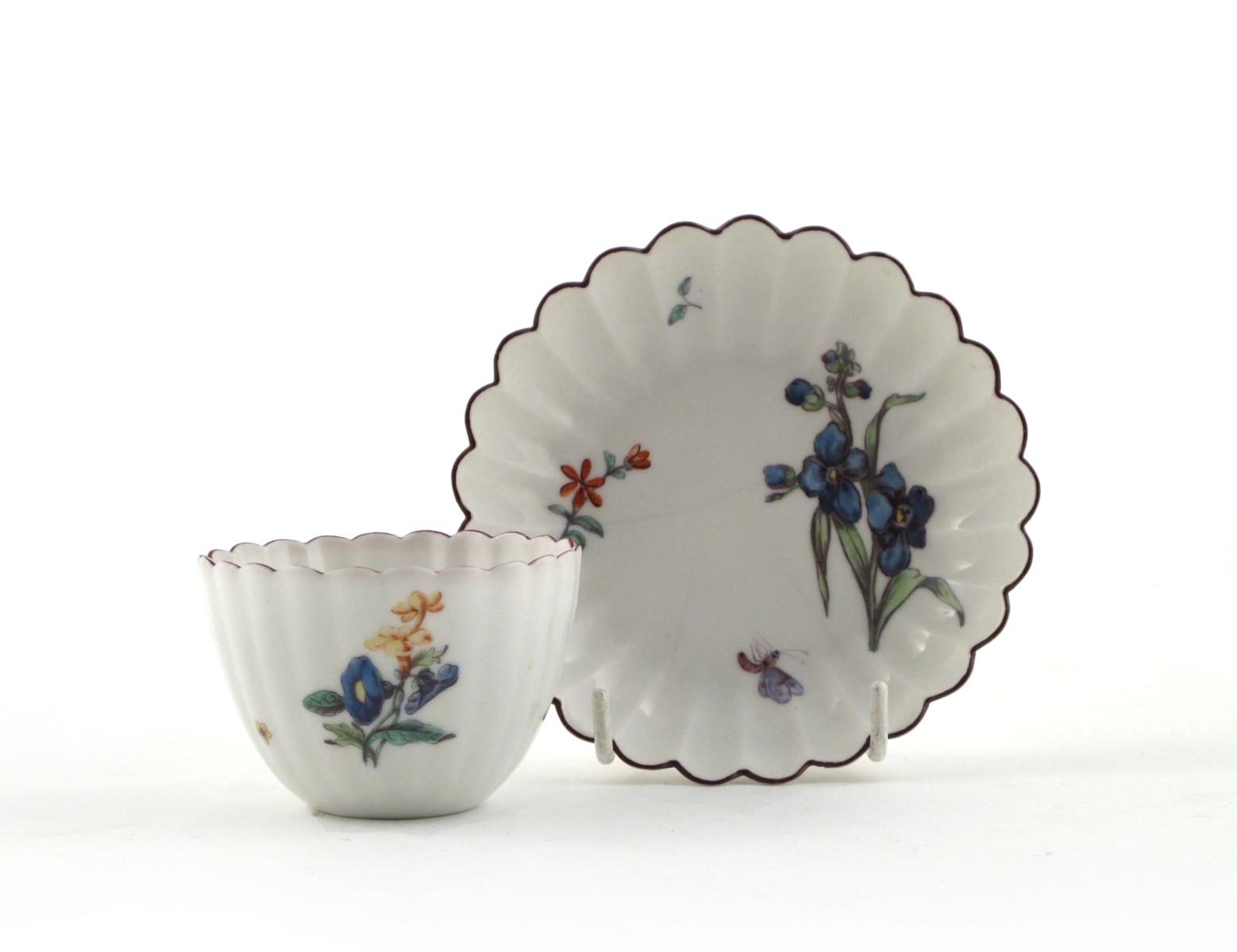 A Chelsea fluted teabowl and saucer c.1758-60, the saucer painted with a spray of blue flowers and a flying insect, the teabowl with scattered blooms and a beetle, brown line rim, the saucer cracked, 11.7cm. (2)