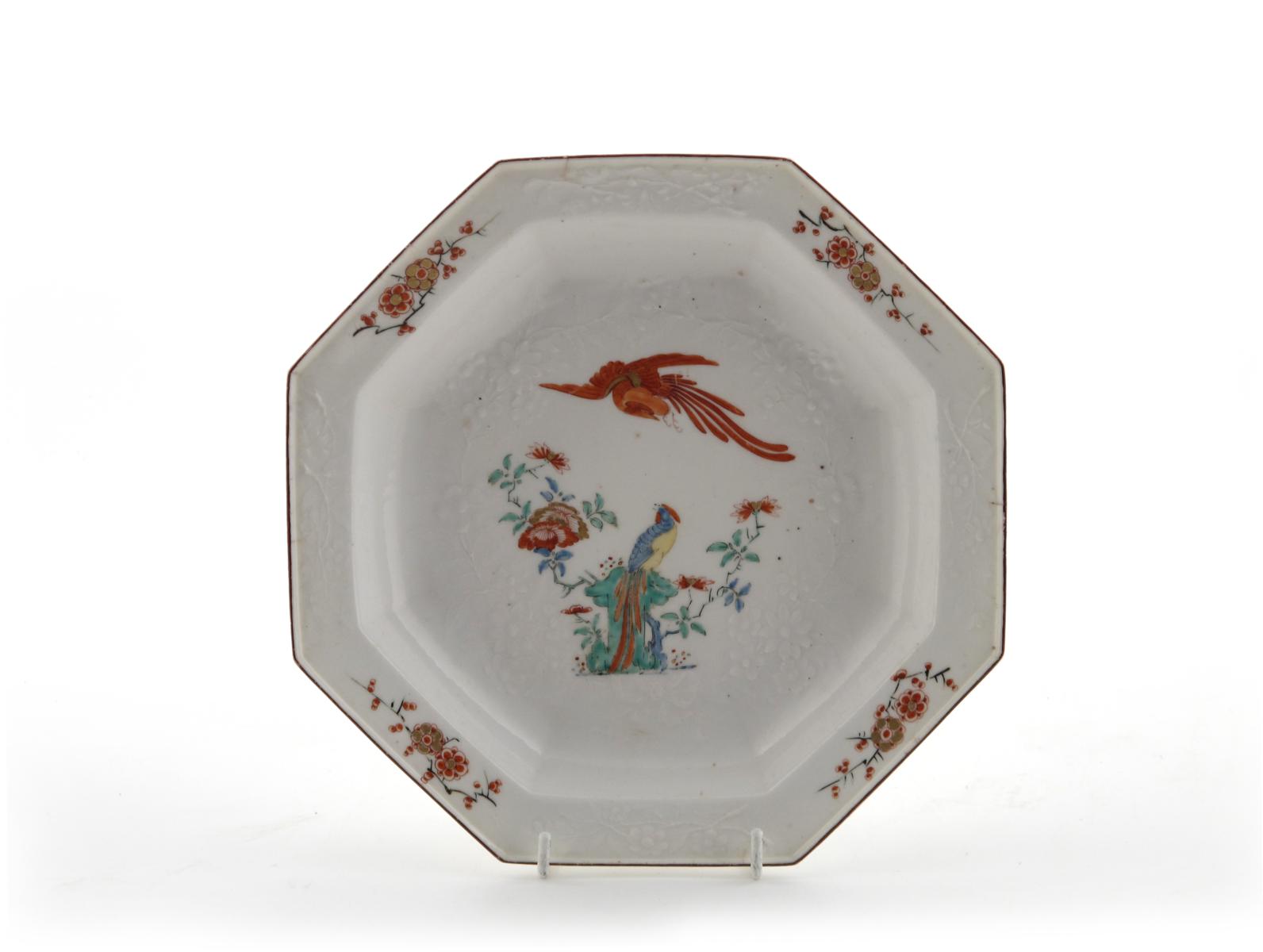 A Chelsea octagonal soup plate c.1752-54 moulded with flowering sprigs of blossom and painted in the Kakiemon palette with a phoenix in flight above a Ho-Ho bird perched on rockwork, brown line rim, red anchor mark, a 1cm hairline, 24.6cm.