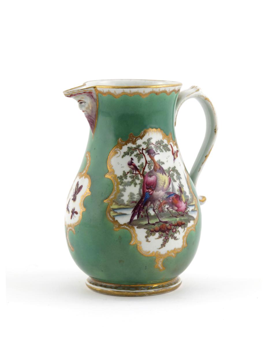 A Worcester mask jug c.1770, painted with panels of colourful exotic birds and moths within scrolling gilt cartouches reserved on an apple green ground, the spout moulded as a bearded face, 18.5cm high.
