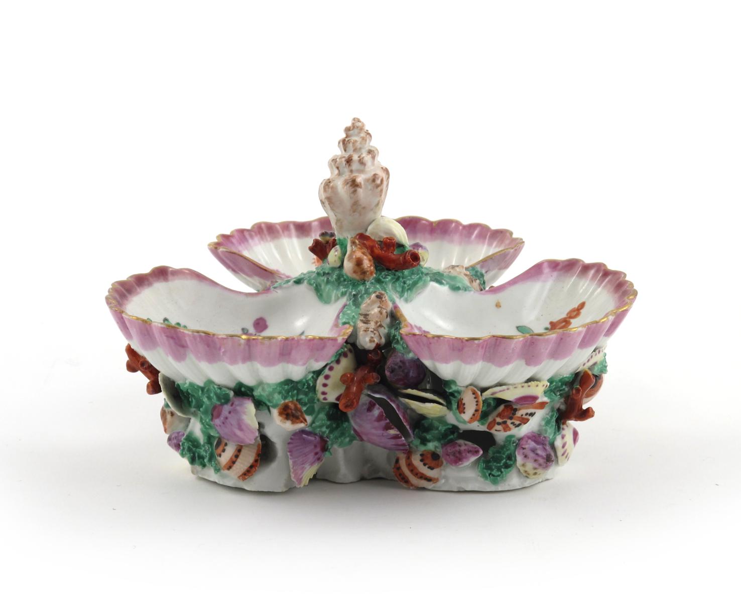 A Worcester triple shell pickle stand or salt c.1765-70, the interior of the three scallop shells painted with large colourful flower sprays, raised on a base encrusted and enamelled with further small shells, some restoration, 15.5cm across.