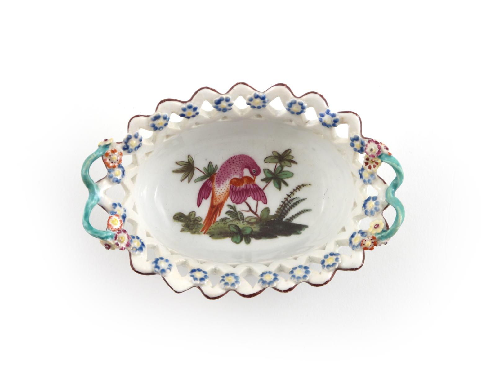 A rare Chelsea miniature basket c.1758-60, the interior painted with a single colourful bird preening its wing, the flared pierced rim applied with small flowerheads, brown anchor mark, a little good restoration to the rim, 11cm across.