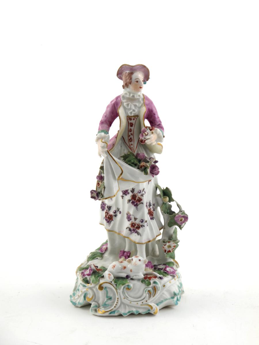 A Derby figure of the Dresden Shepherdess c.1760, her apron full of flowers, holding a small posy in her left hand, a recumbent lamb at her feet, chips to the flowers and leaves, 20.8cm.
