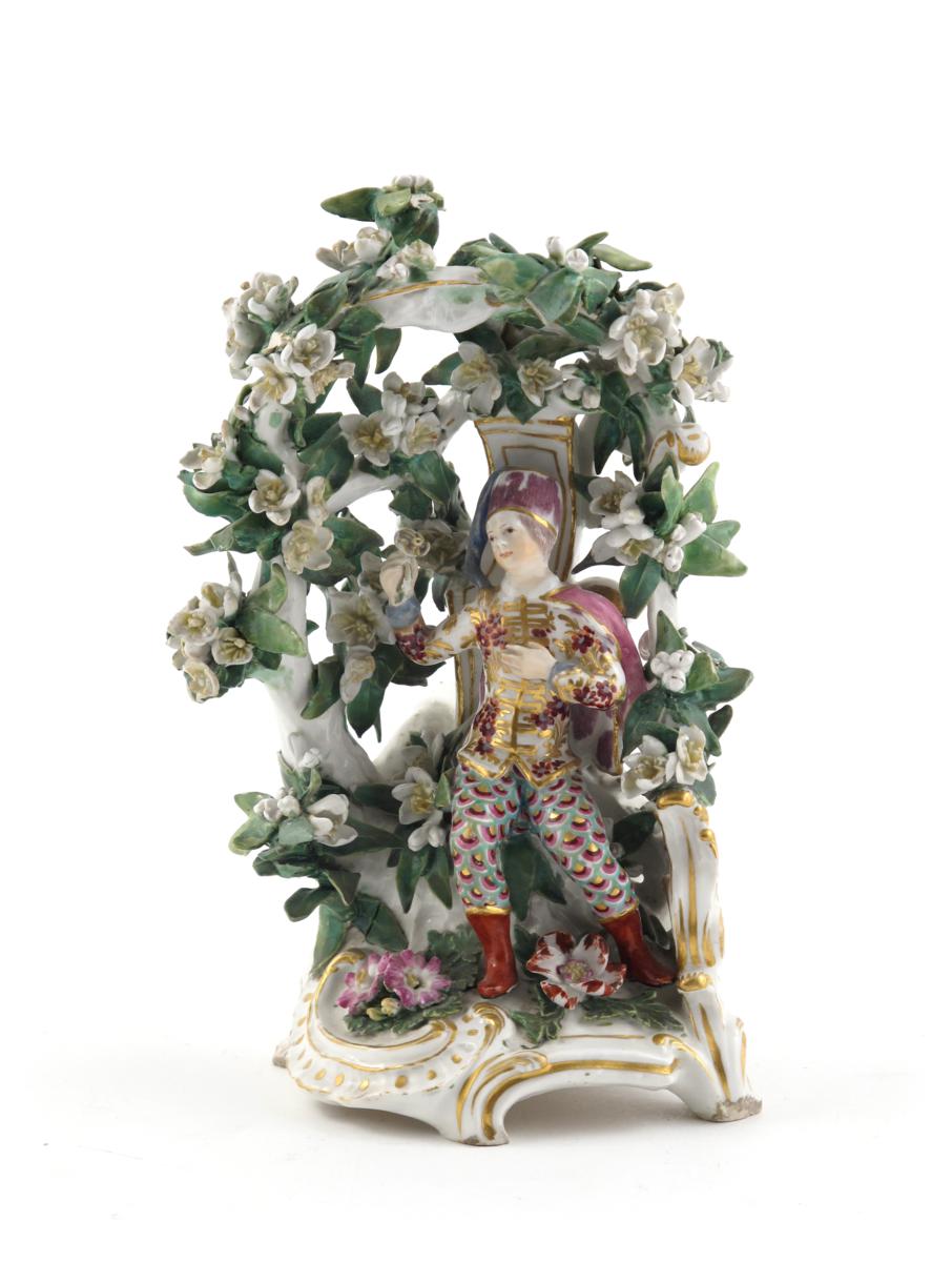 A Chelsea figure of a Russian c.1763, seated beneath a flowering arbour and holding a single bloom in his right hand, wearing a tall fur hat and with his other hand clutched to his breast, raised on a rococo scrolling base, a handle to the reverse, gold anchor mark, some small damages and restorations, 21cm.