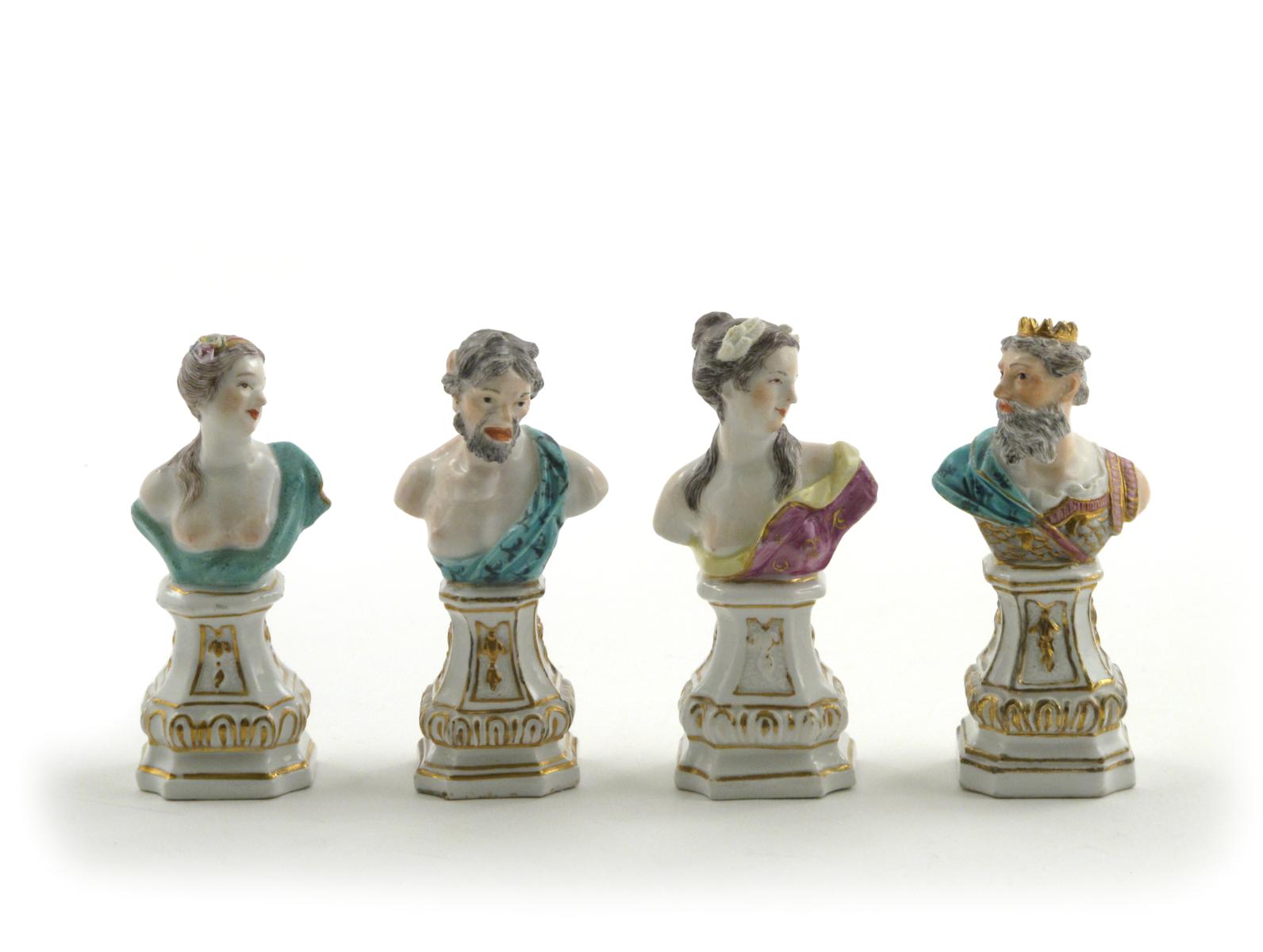 Four Meissen miniature busts 2nd half 18th century, two of female Seasons (Spring and Summer) with flowers or corn in their hair, one of a satyr with pointed ears protruding from his greying hair, the last of Neptune wearing a small gold coronet, all raised on tapering plinths with gilt highlights to the moulded detailing, blue crossed swords marks and some incised marks, 8.5cm max. (4)