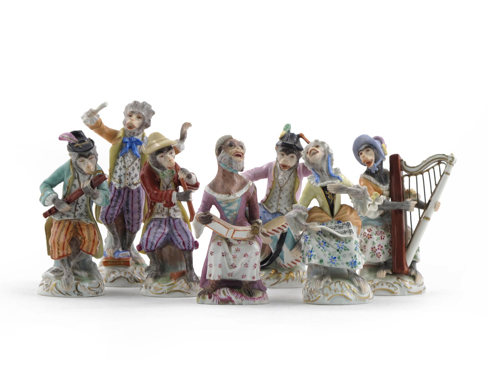 A Carl Thieme part monkey band late 19th century, after Meissen, and a French porcelain model of a monkey singer, modelled with various instruments including the harp, bassoon and drum, and with colourfully enamelled attire, blue printed marks, restoration to the French figure, 16cm max. (7)
