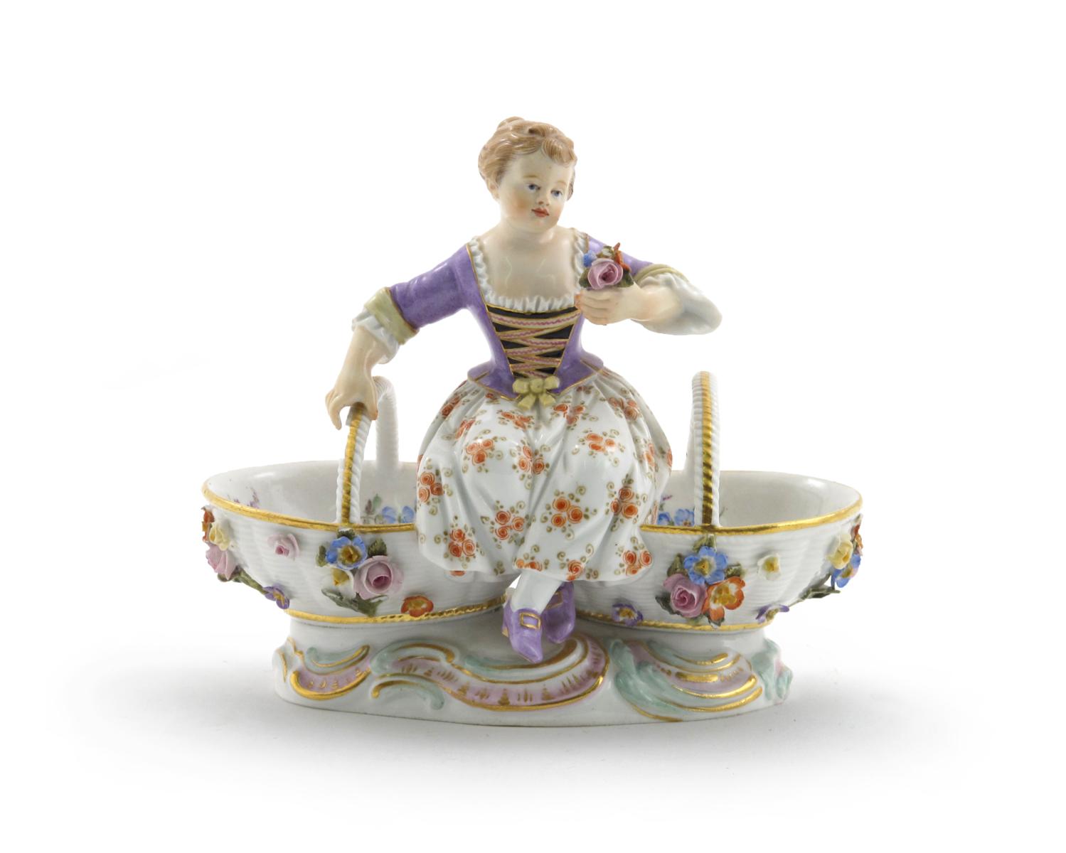 A Meissen sweetmeat figure 19th century, modelled as a girl seated between two baskets applied and painted with flowers, holding a posy of flowers in her left hand, blue crossed swords mark, 14.5cm across.