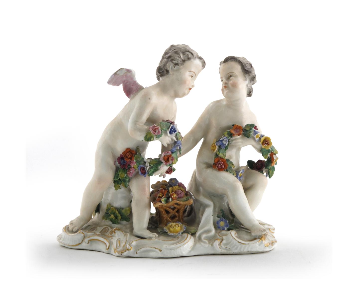 A Meissen figure group of Summer 18th century, modelled as two putti holding garlands of flowers and taking further blooms from a basket between them, faint blue crossed swords mark to the reverse, 14cm across.