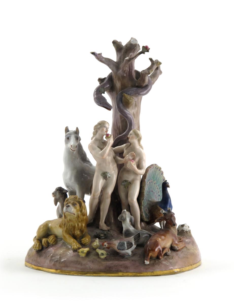 A Meissen figural group of the Garden of Eden 19th century, modelled with Adam and Eve standing beneath the Tree of Knowledge and about to partake of the Forbidden Fruit, the serpent coils around the branches above them while different animals gather around them, blue crossed swords mark, incised 665, damages, 28cm.