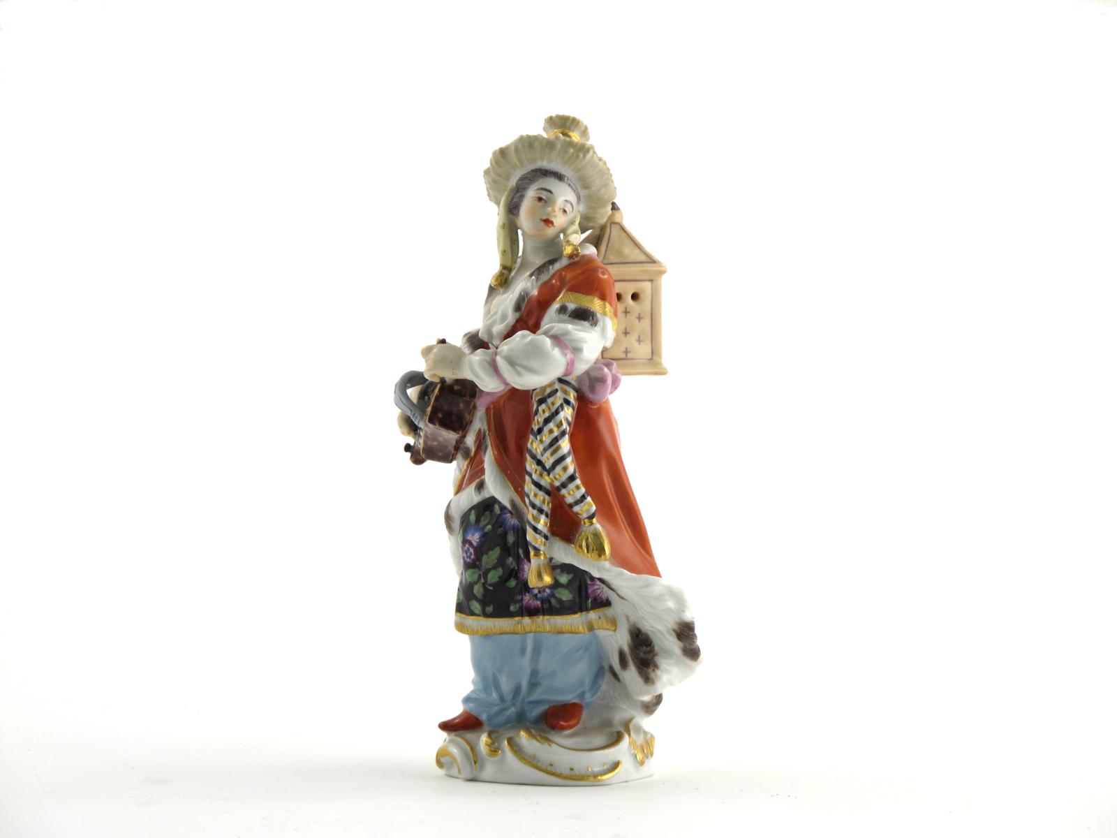 A Meissen model of an Eastern musician 20th century, holding a hurdy-gurdy type of instrument and with a box on her back, wearing an elaborate hat and fur-lined cloak, blue crossed swords mark, 18cm.