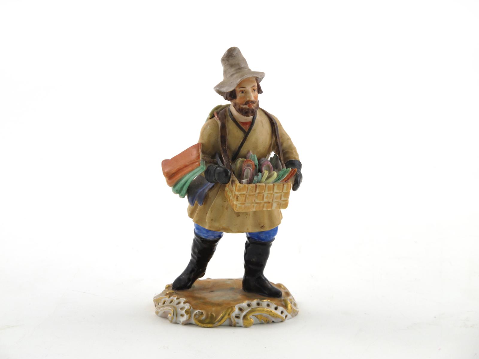 A good Russian porcelain figure by the Imperial Porcelain Factory in St Petersburg period of Nicholas I (1825-55), of a shoe pedlar carrying a box of colourful footwear slung around his neck, with tied pairs of boots hanging from one arm and his shoulder, raised on a scrolled edge base, blue factory mark, 14.5cm.