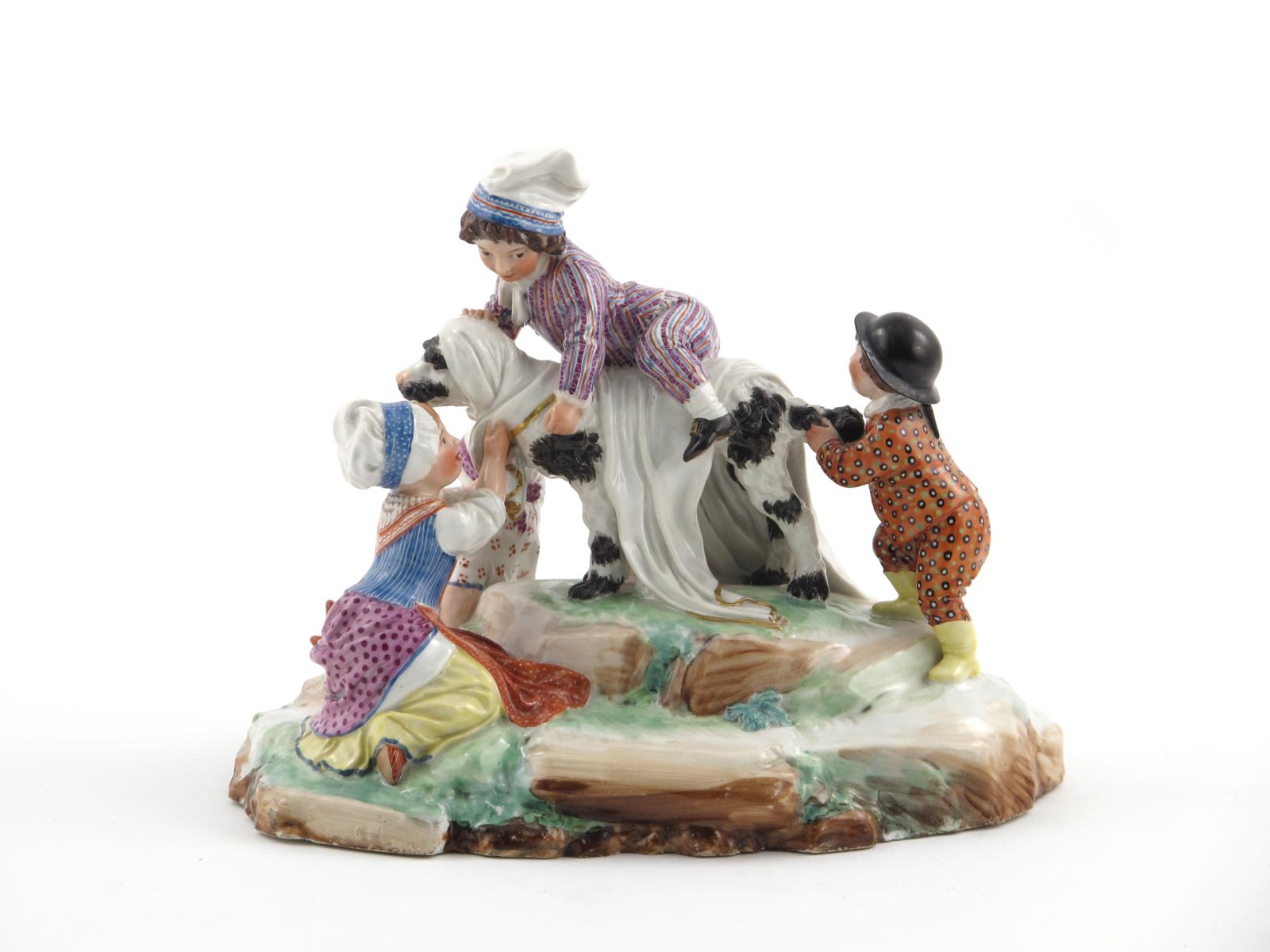 A Frankenthal group of four children and a dog c.1783, modelled by J P Melchoir, the patient hound draped in a gilt-edged cloth which a girl holds beneath his chin while her brother clambers on his back, a third child holds his tail while a fourth tumbles down beside, crowned CT monogram and 83 date code, 22.5cm.