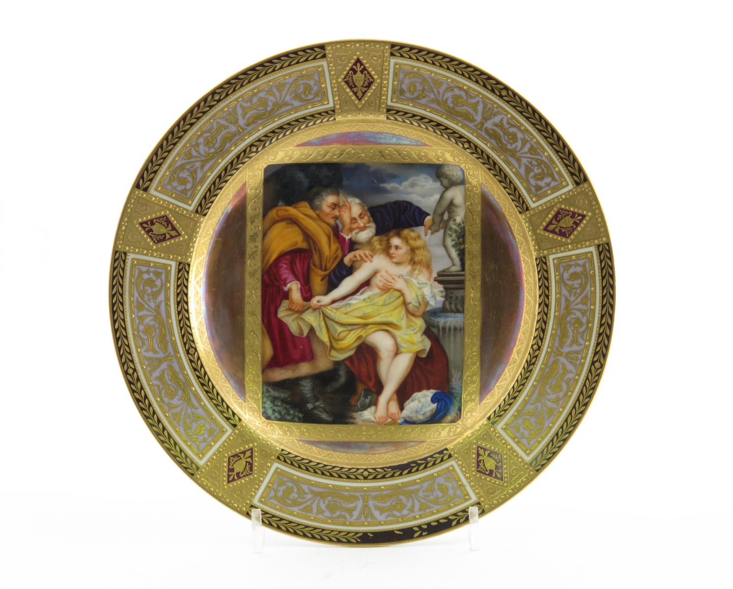 A Vienna mythological plate c.1813, the well brightly painted with a rectangular panel containing Susanna clutching her robes about her while two elders attempt to disrobe her, within lustred panels and an elaborate gilded and panelled rim, blue shield mark and date code 813, 24.3cm.