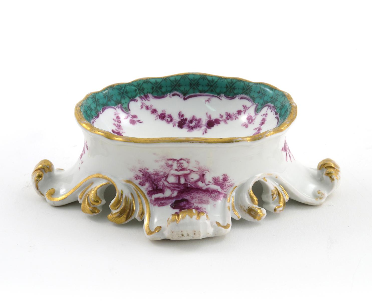 A Meissen salt mid 18th century, the oval dish set into splayed scrolling feet painted in purpurmalerei with putti at play, the well with flower garlands in the same palette within a green hatched border, blue crossed swords mark, 11.6cm across.