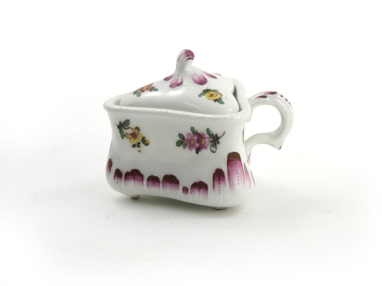 A Vienna triangular custard cup and cover c.1770, painted with small floral sprays above a purple stylized leaf border, blue shield mark, '42' in puce, 8cm. (2)