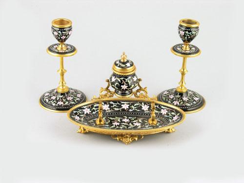 A French enamel and gilt metal desk set, comprising: a pair of candlesticks and an inkstand with pen holder, the mounts stamped 'G', 5.75in (14.6cm) h, 7.25in (18.4cm) w. (3) Some restoration.