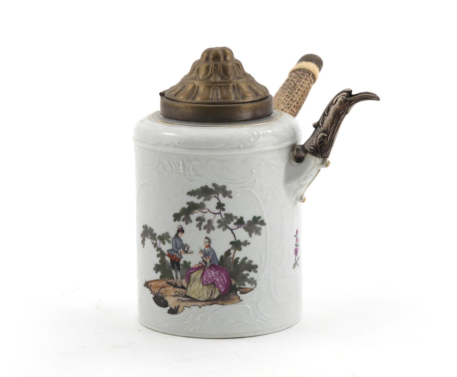 A German porcelain coffee or chocolate pot c.1770-80, perhaps Ludwigsburg, moulded with leafy rococo panels and painted with a young maiden being served a hot drink beneath trees, with a side handle, replacements to the cover, spout and handle, 25.5cm.