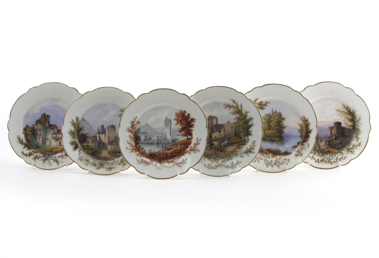 A set of six Paris porcelain plates c.1871, variously painted in detail with landscape scenes, of figures approaching a castle gate, of cattle drinking in a lake, and other chateau scenes, two signed 'H. Lemarchant 1871', four signed on the reverse 'L. Lemarchant 1871', 22.2cm. (6)