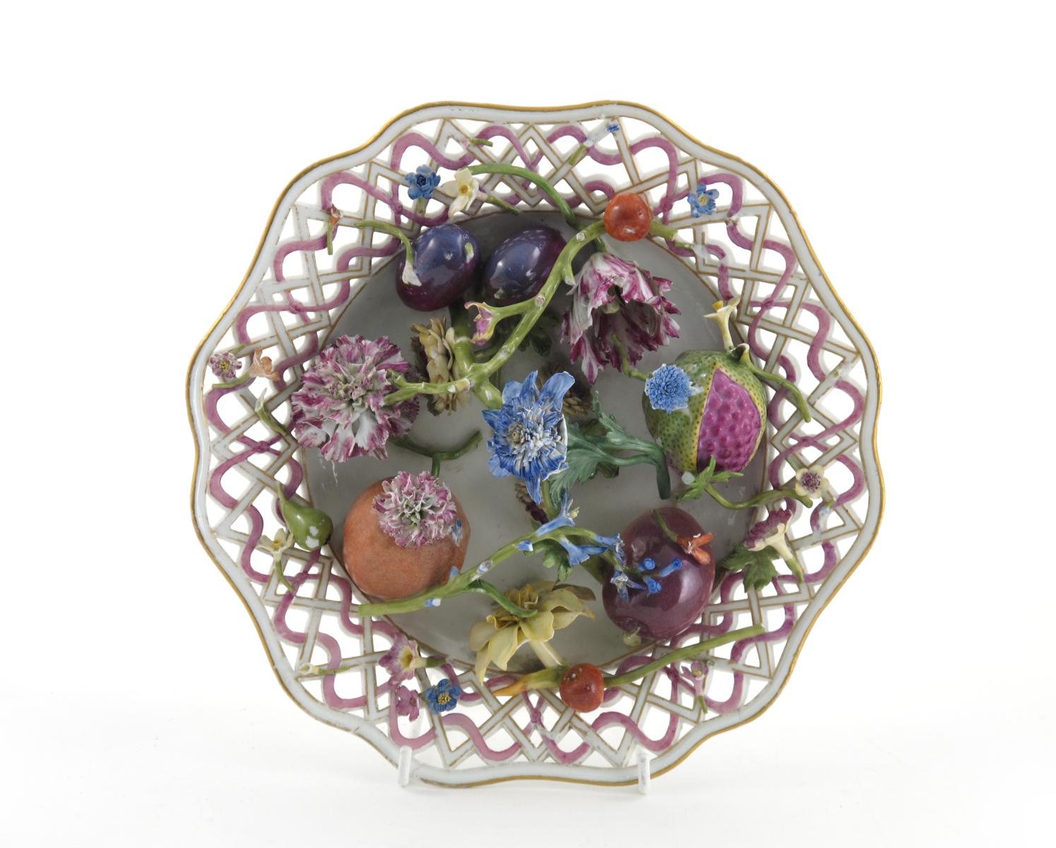 A Meissen plate of flowers and fruit c.1770, with a shaped and reticulated rim, the well applied with a mound of fruit and flowers, blue crossed swords and dot mark, some chipping, 24.5cm.