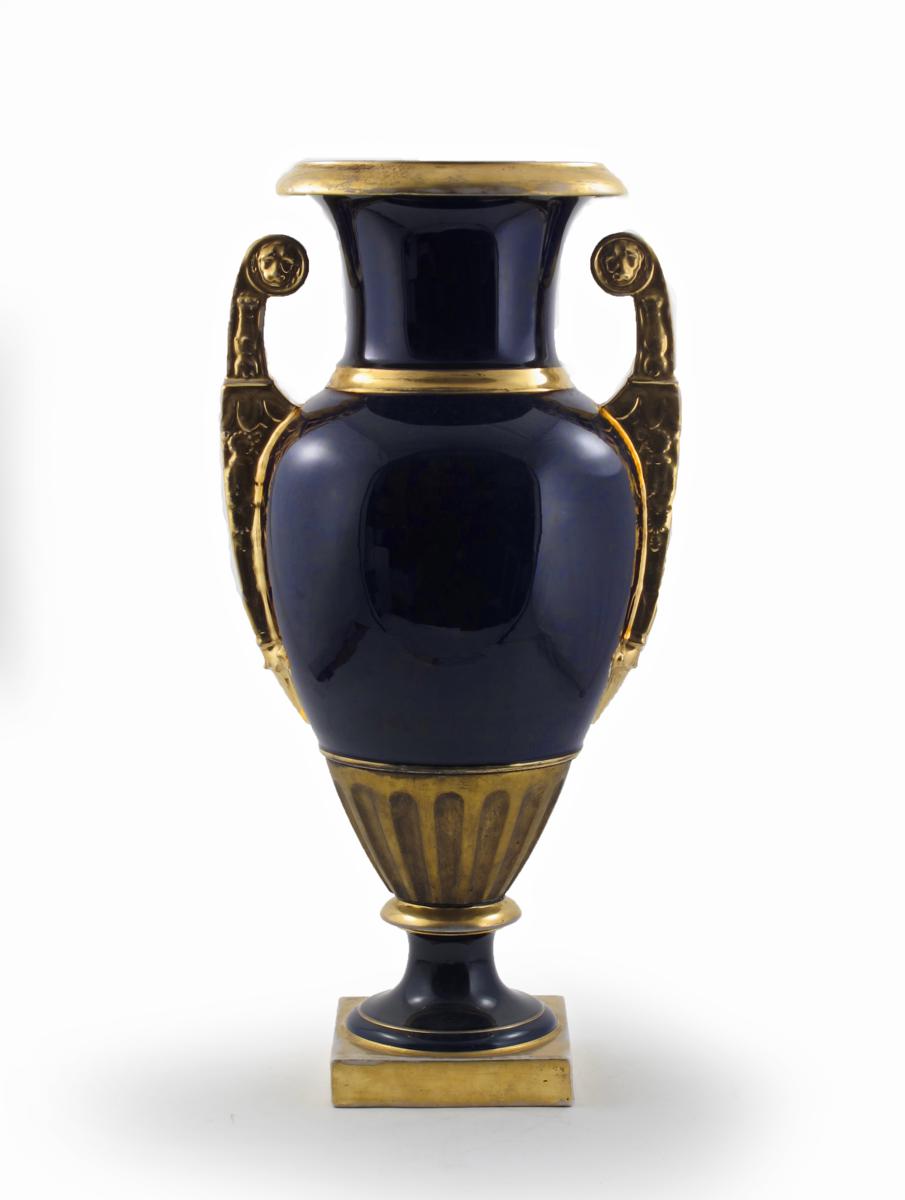 A massive Continental porcelain two-handled vase 19th century, the scrolling handles moulded with lion masks, the body glazed a rich cobalt blue and raised on a square gilded foot, some wear, 72.5cm.