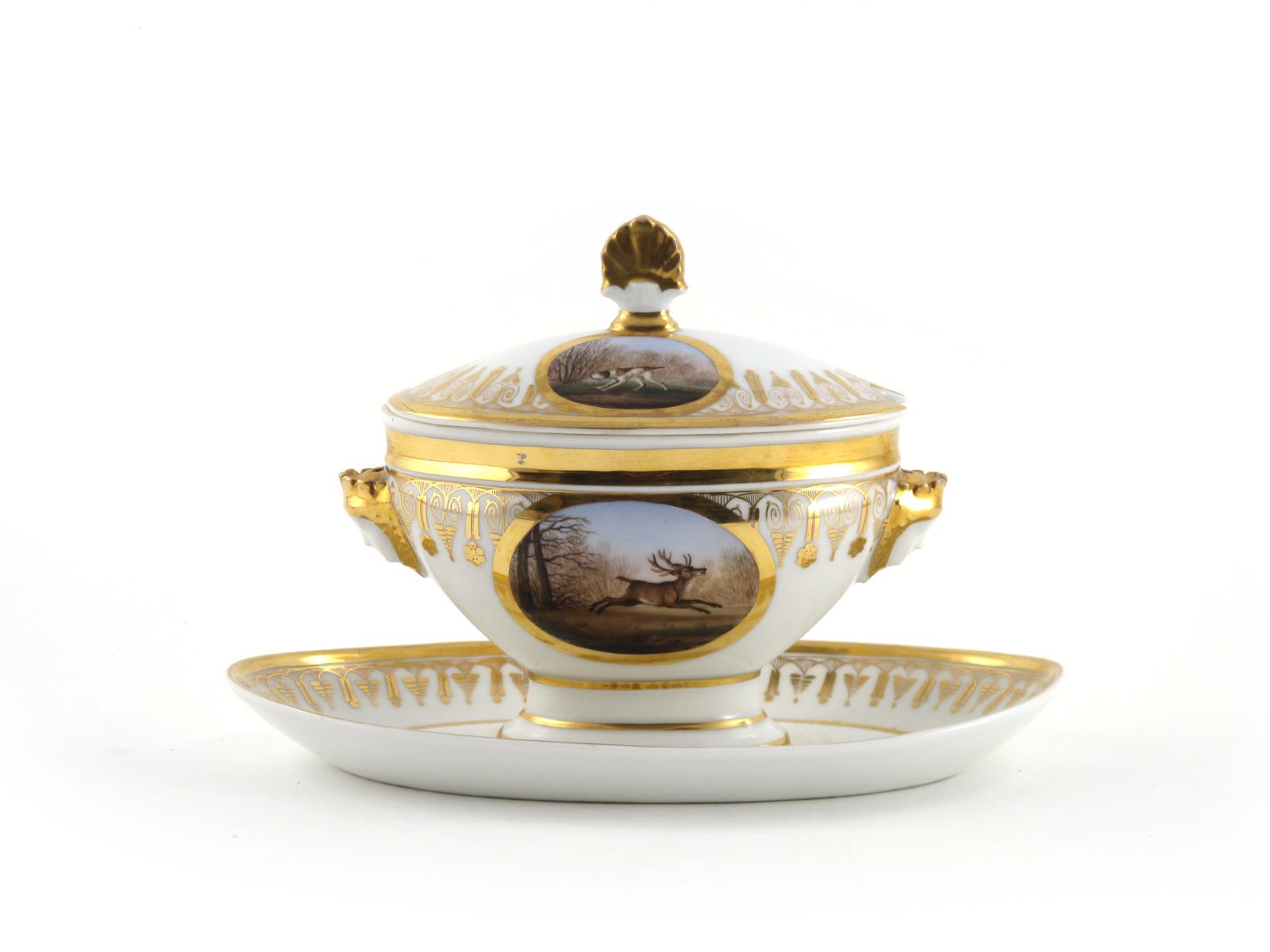 A Paris porcelain sauce tureen and cover 19th century, with integral stand, painted with panels of a stag running, and a dog chasing a bird in flight, the cover with panels containing two hares and a dog, within bold gilt borders, 26cm. (2)