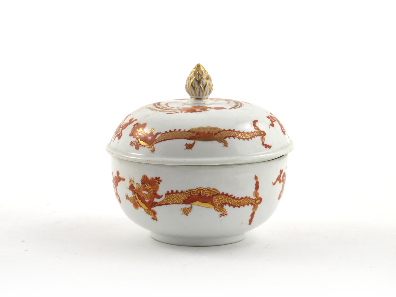 A Meissen bowl and cover early 19th century, decorated in red and gilt with the Red Dragon dinner pattern, with long sinuous beasts and phoenix encircling the bodies, blue crossed swords and I mark, the cover broken and restuck, 14.6cm across. (2)
