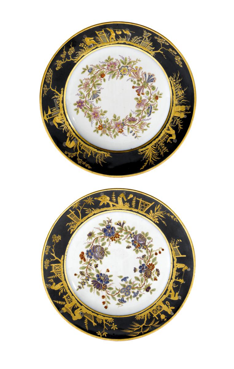 A rare pair of Sèvres chinoiserie plates c.1795, the wells finely painted with continuous garlands of polychrome flowers, the rims richly decorated in gilt and platinum on a blue-black ground, each with three chinoiserie scenes of Oriental figures playing games and at other pursuits, each marked 'Sèvres' to the reverse, 24.4cm. (2)