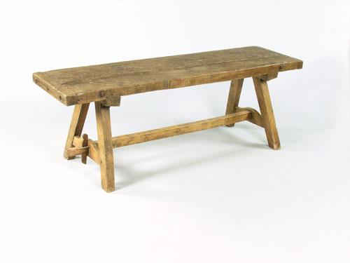 A 19th century French ash butchers bench, having a cleated top on 'A' frame end supports united by a central stretcher, 23in (58.4cm) h, 67in (170cm) w, 18.5in (47cm) d.