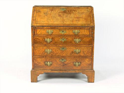 A George II walnut bureau, with feather banding, the top and fall crossbanding inset leather surface to drawers and pigeon holes, the four long drawers filled to later pierced brass plate handles and escutcheons on later bracket feet, 40.25in (102.3cm) h, 34.75in (88.2cm) w, 21in (53.3cm) d.