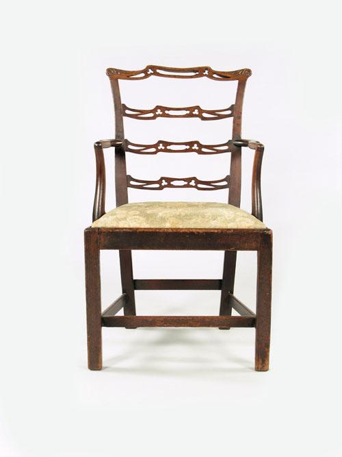 A George III mahogany open armchair, the pierced ladder back with foliage carved top rail, to a drop in seat, old repairs.
