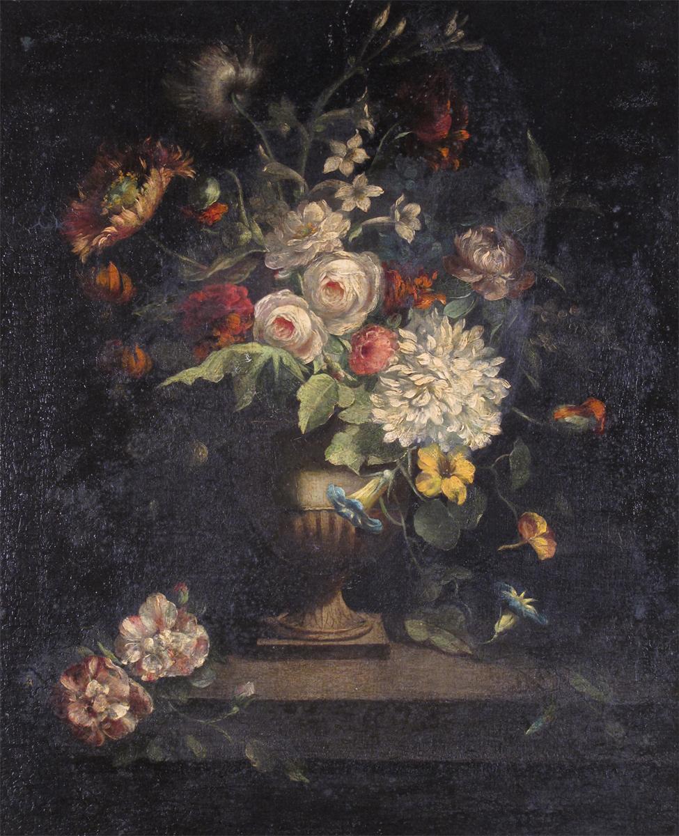 Style of Jean-Baptiste Monnoyer Still life of flowers in an urn on a shelf Oil on canvas 76 x...