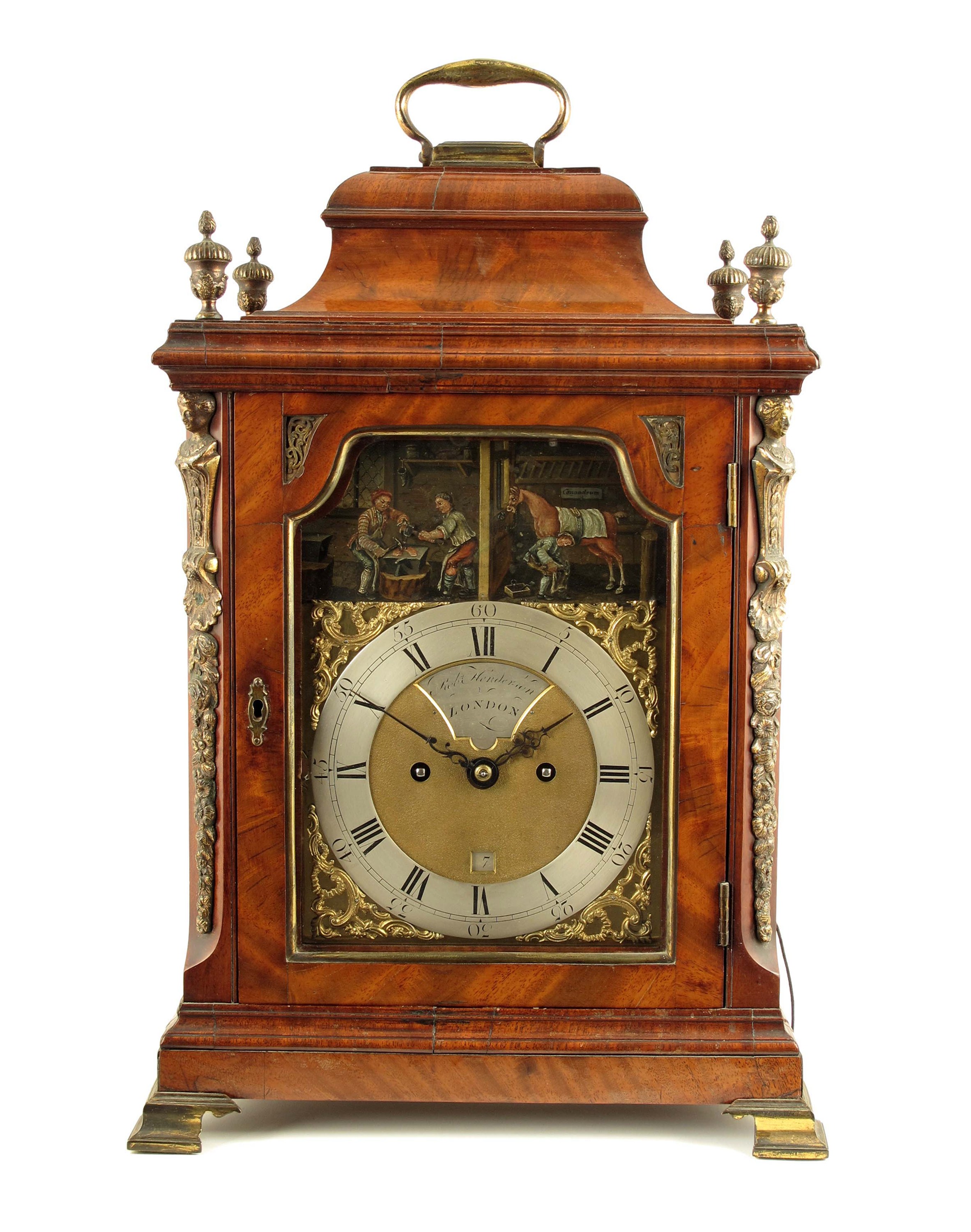 A George III striking mahogany bracket with automaton, the 7 inch brass dial signed on a recessed silvered plaque in the matted centre Robert Henderson, London, date aperture, scrolled foliate spandrels, Strike/Not lever at 9 o'clock, the shallow arch painted with a scene of two blacksmiths shaping a horseshoe on an anvil, both with automaton arms and hammers, alongside a loosebox with a third farrier shoeing the rear fore of a horse, being his name Conundrum on a plaque behind, the movement with verge escapement, the foliate scroll engraved backplate centred with a basket of flowers, half hour passing strike, the two train fusee movement with trip repeat, in a mahogany bell top case flanked by brass caryatids, urn finials and ogee feet, surmounted by carrying handle, 1ft 7½ in (50cm) high.