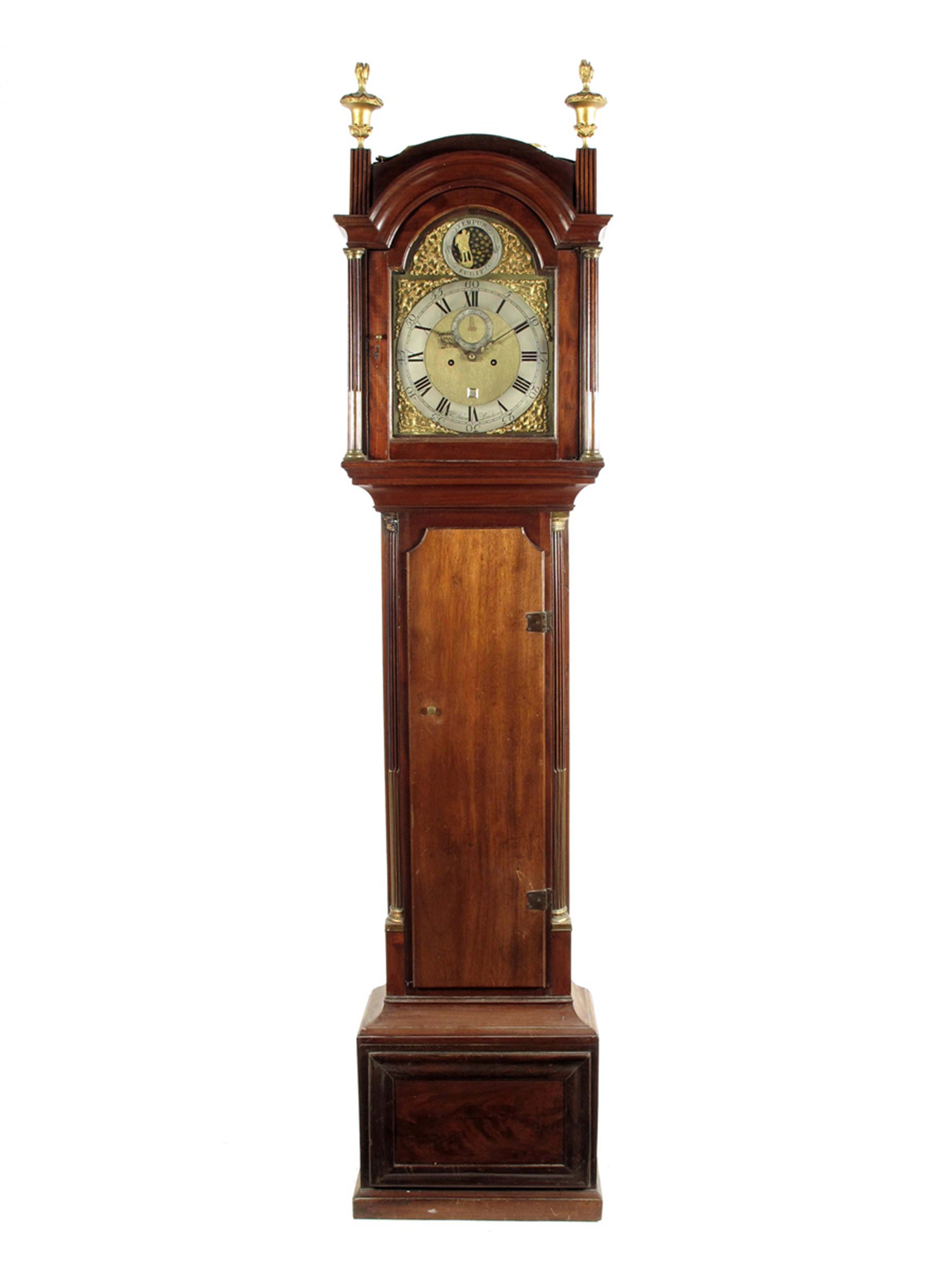 An 8 day mahogany longcase clock with automaton, the 12 inch brass dial singed on the silvered chapter ring Jno Dewe, London, subsidiary seconds and date aperture in the matted centre, the arch containing and automon of Old Father Time, the 4 pillar movement in a break arch case, 7ft 5in (226cm) high.