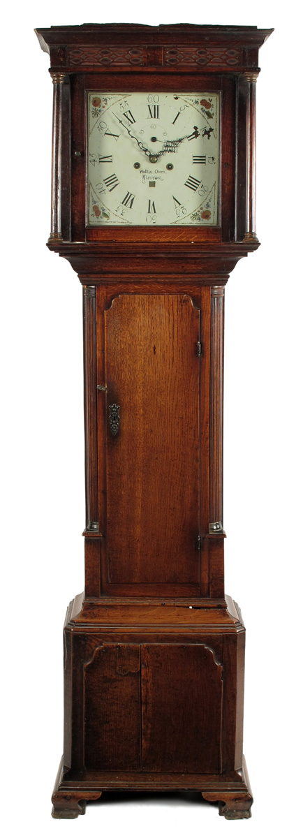 An 8 day oak longcase clock, the 13 inch painted dial signed Watkin Owen, Llanrwst, subsidiary seconds and date aperture, florally painted spandrels, 4 pillar movement in a flat topped case, with blind fret, panelled plinth, the trunk flanked by fluted pilasters, 6ft 8in (203cm) high.