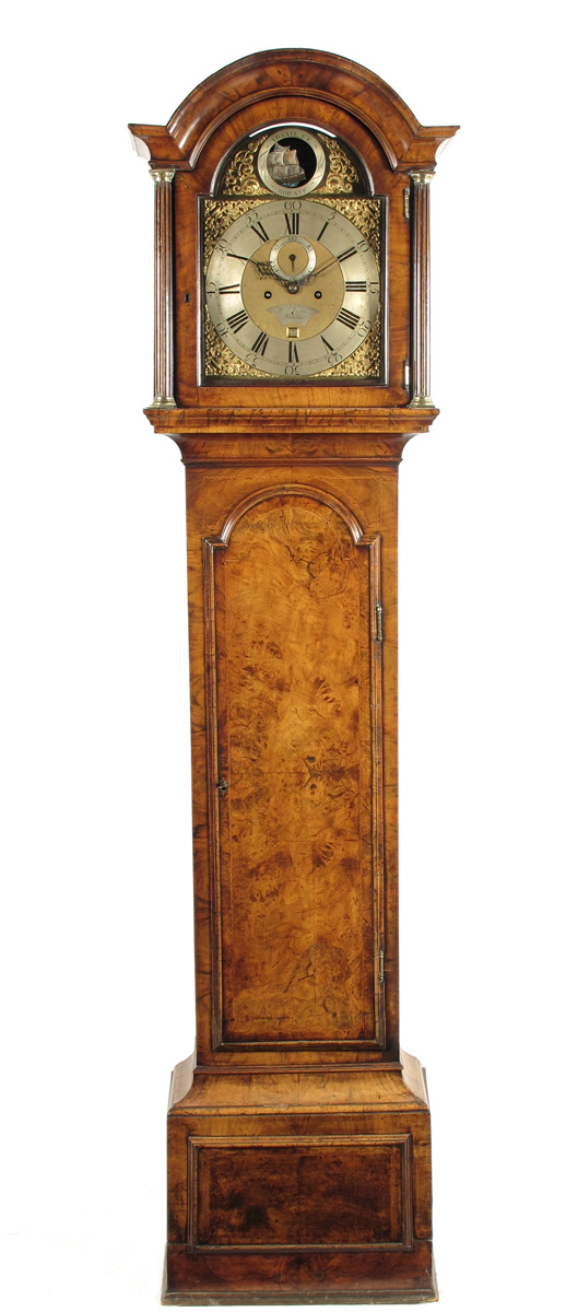 An 8 day longcase clock with automaton, the 12 inch brass dial signed Wm Mason, London, on a silvered plaque in the matted centre, subsidiary seconds and date aperture, the arch with a painted ship automon within a silvered ring, engraved Viglate et Horate, in a break arch case of good colour, with a panelled plinth, the hood with fluted columns, 7ft (213cm) high.
