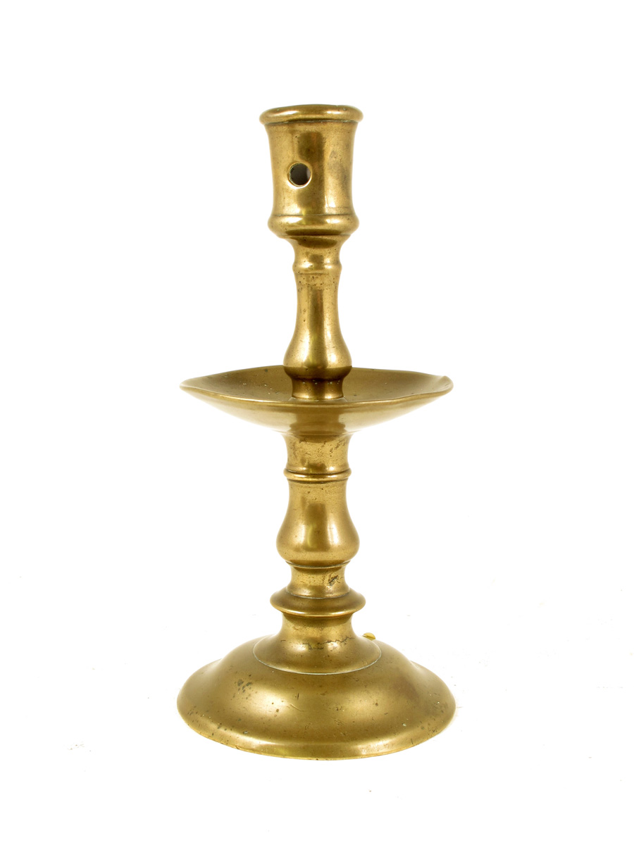 A late 16th century Dutch 'Heemskerk' brass candlestick, the nozzle with two extracting holes above a dished drip-pan, 7¾in (19.3cm) high, 3¾on (9.2cm) diameter.