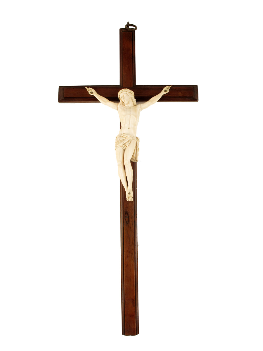 A 19th century carved ivory Corpus Christi, mounted on a rosewood cross, with a suspension ring, the verso inscribed 'XMAS 1911', the figure: 6¾in (17.3cm) long, the cross: 19½in (49.5cm) long.